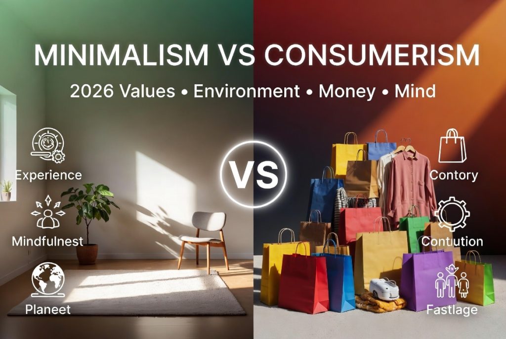Minimalism vs consumerism forces choices with real trade-offs — convenience and economic activity on one side, and reduced waste, lower debt, and clearer identity on the other. In 2026, rising ad budgets, digital consumption patterns, and supply-chain waste make these choices more consequential.